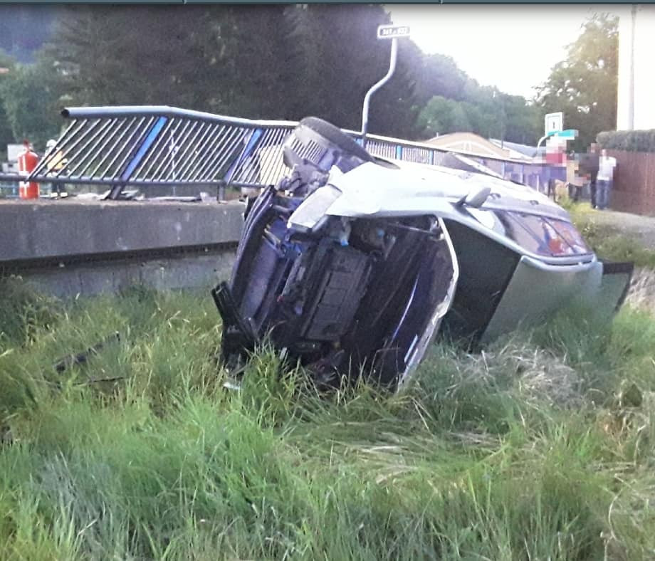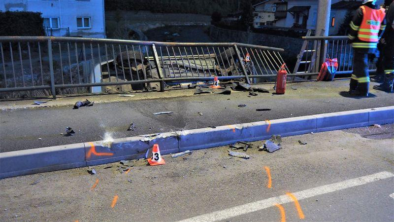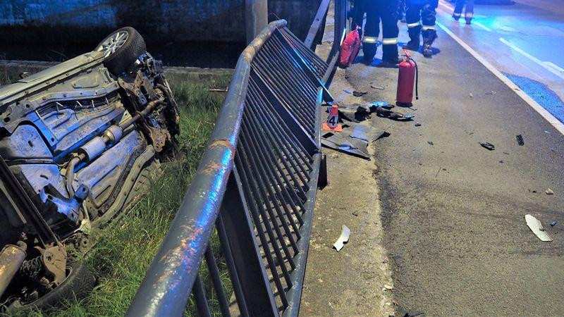 FOTO: Opilý řidič prorazil zábradlí mostu a skončil převrácený na boku