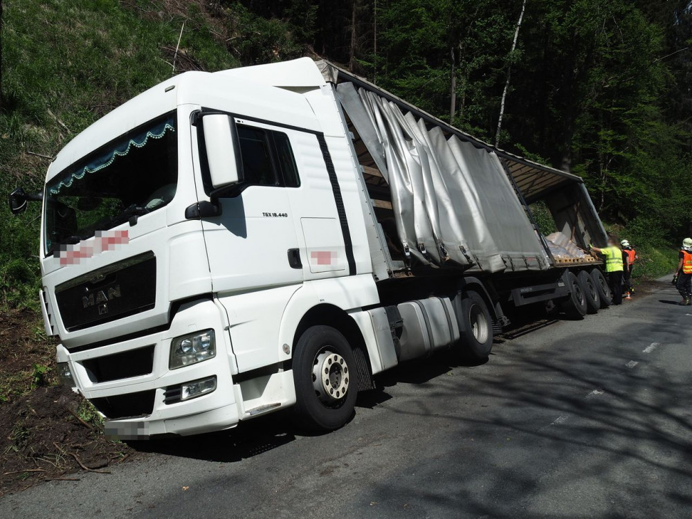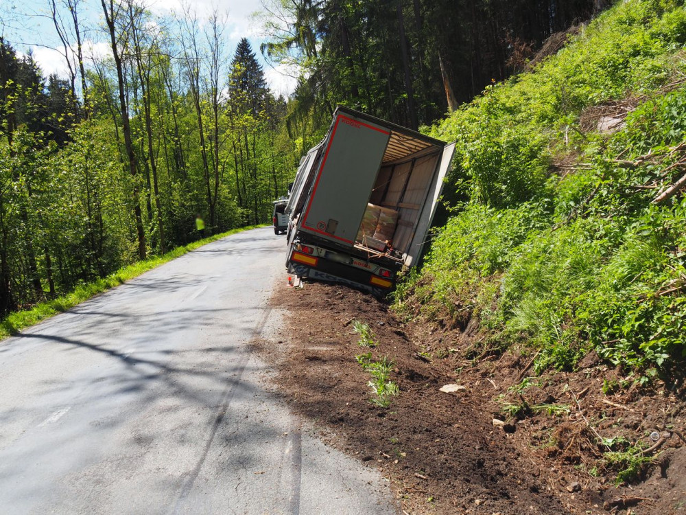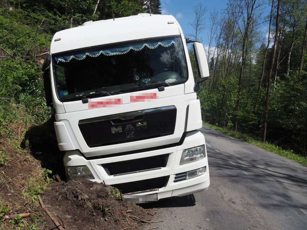 FOTO: Řidič kamionu najel na nezpevněnou krajnici a skončil v příkopu