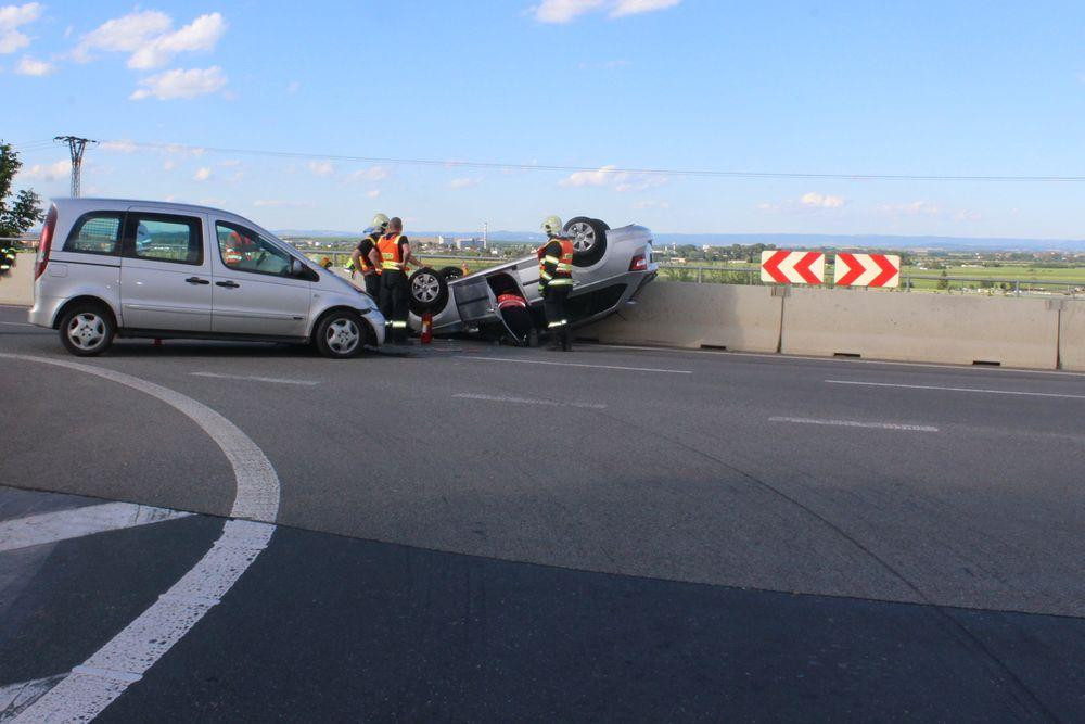 Senior se po sjezdu z dálnice střetl s Mercedesem, převrátil auto na střechu, zranil se řidič i spolujezdkyně