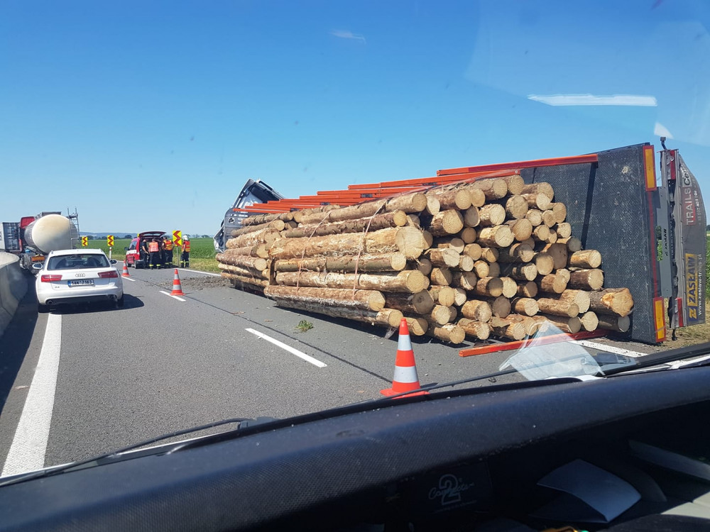 Dálnici D35 zablokoval havarovaný kamion. U kruhového objezdu u Globusu se tvoří dlouhé kolony