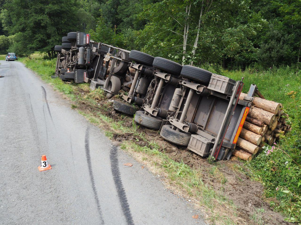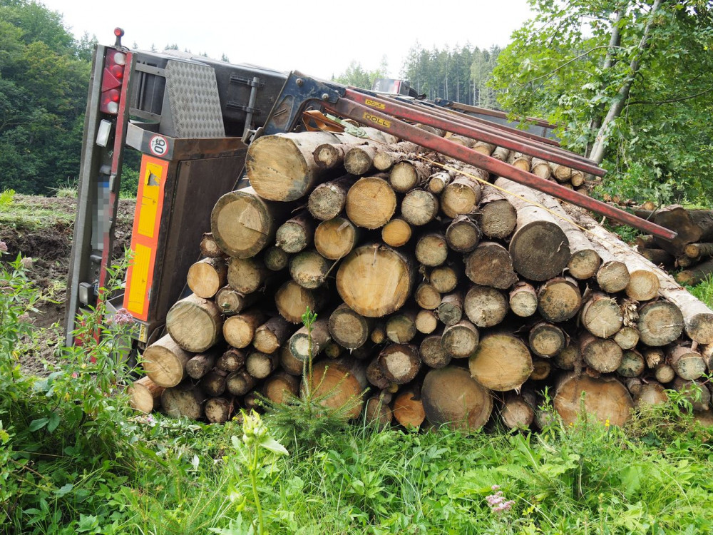 Pod naloženým kamionem se dřevem se utrhla krajnice. Škoda se vyšplhala k milionu korun