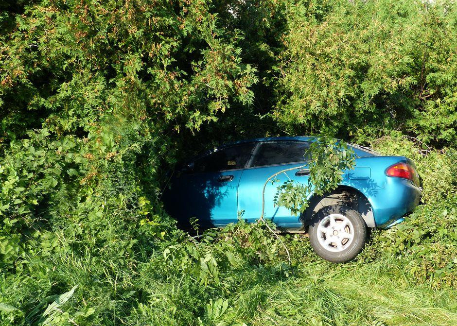 Řidička nezvládla řízení a skončila v živém plotě blízkého domu. Foto z místa nehody.