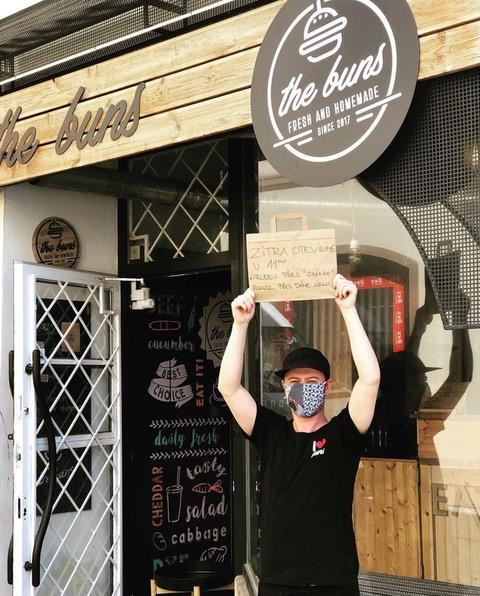 The buns zve své zákazníky do otevřeného okénka.