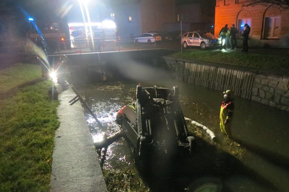 Auto se při pádu do vody převrátilo na střechu.