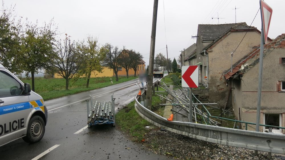 Z nákladního auta se uvolnilo lešení. Trubky poškodily i dva rodinné domy