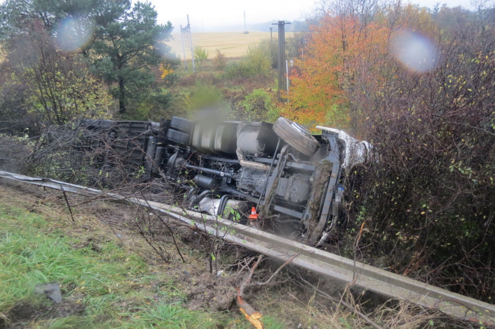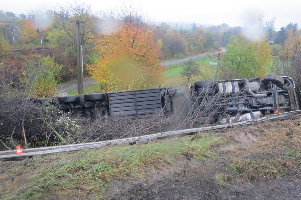 Kamion skončil převrácený na boku.