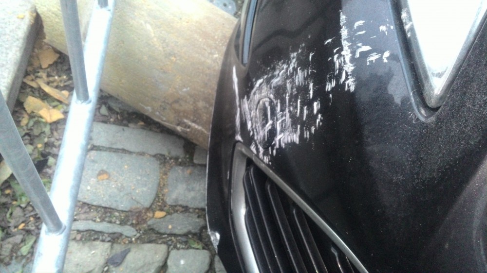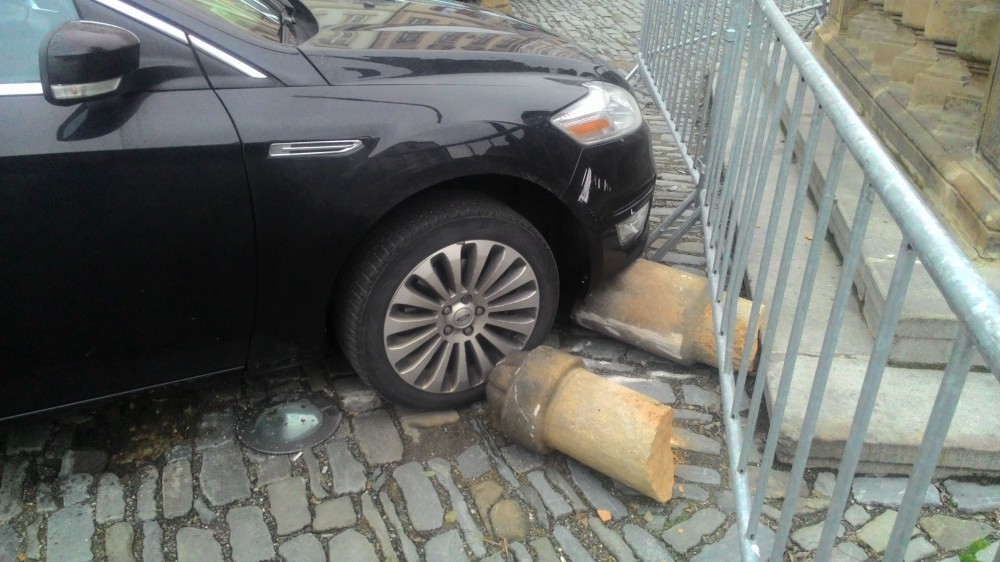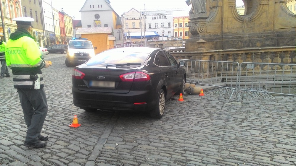 Dnes ráno byl na Dolním náměstí poškozen Morový sloup, najelo do něj auto
