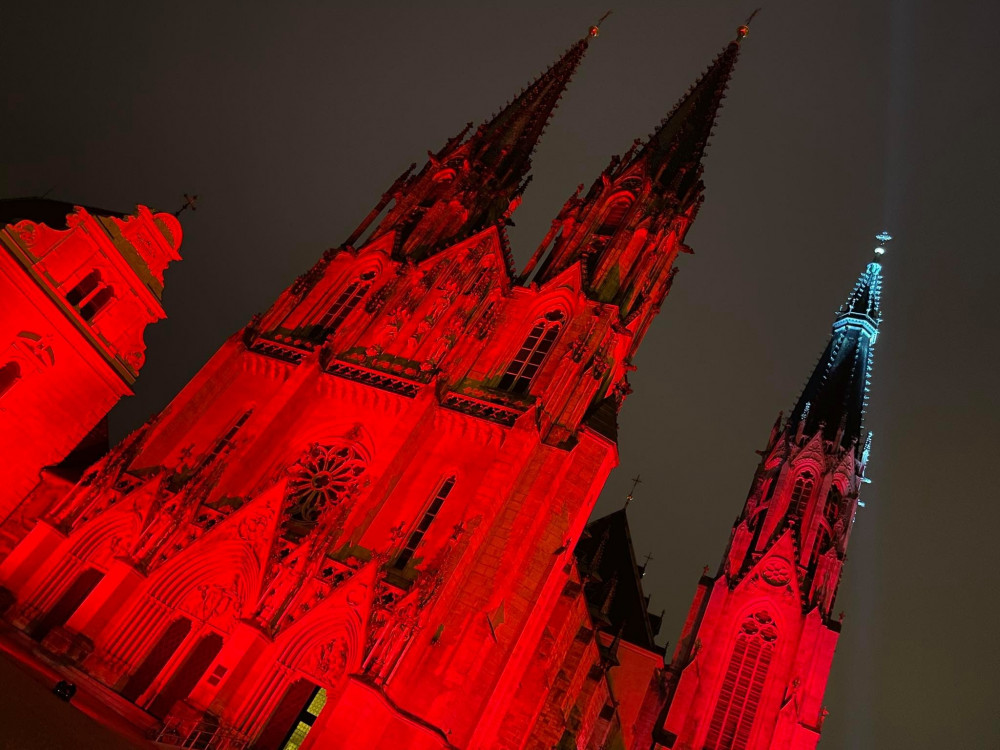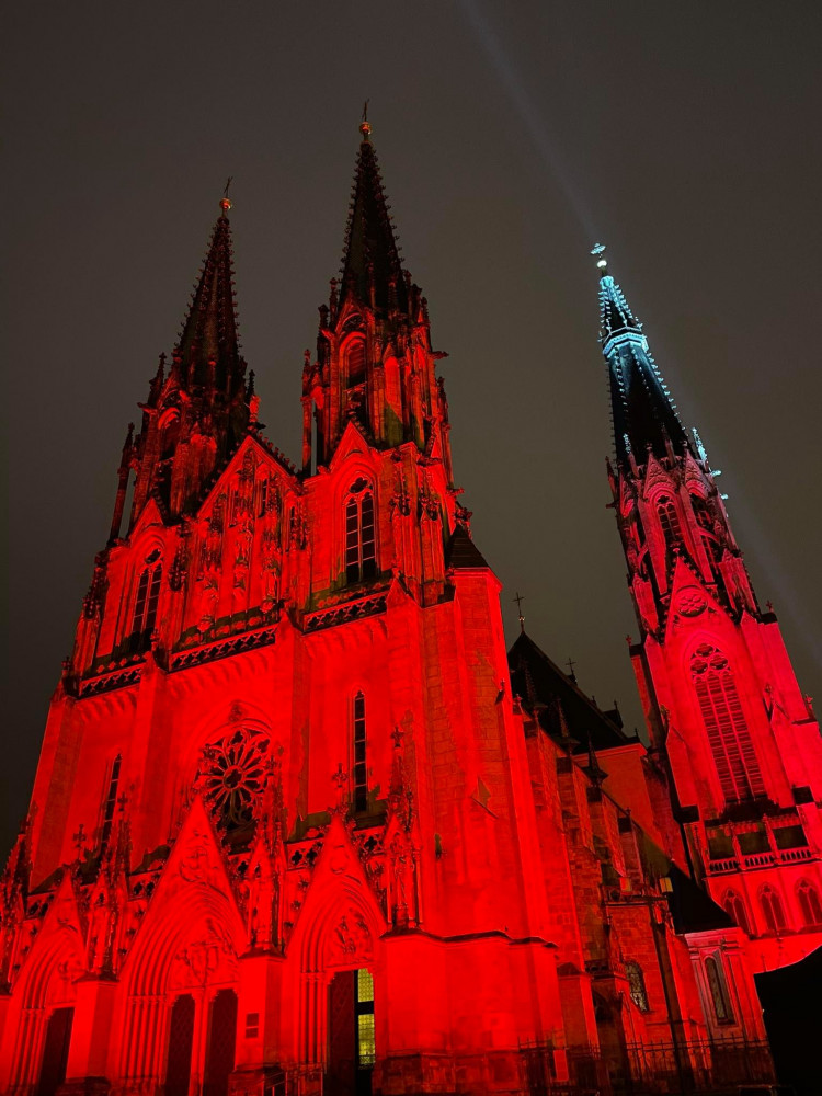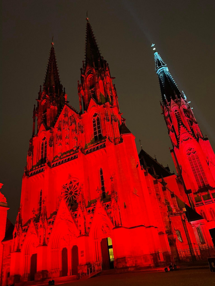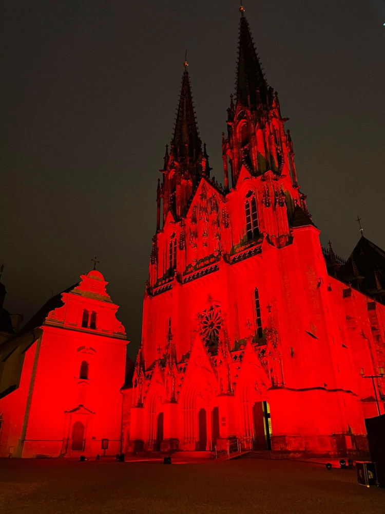 FOTO: Olomoucká Katedrála svatého Václava se ve středu rozsvítila rudou barvou
