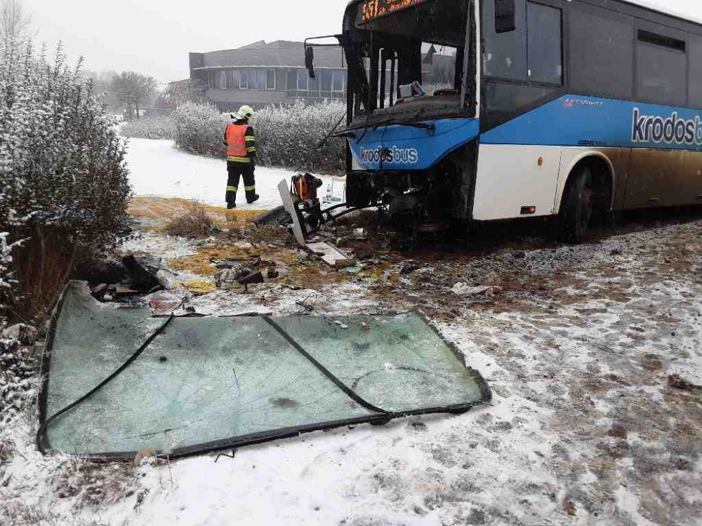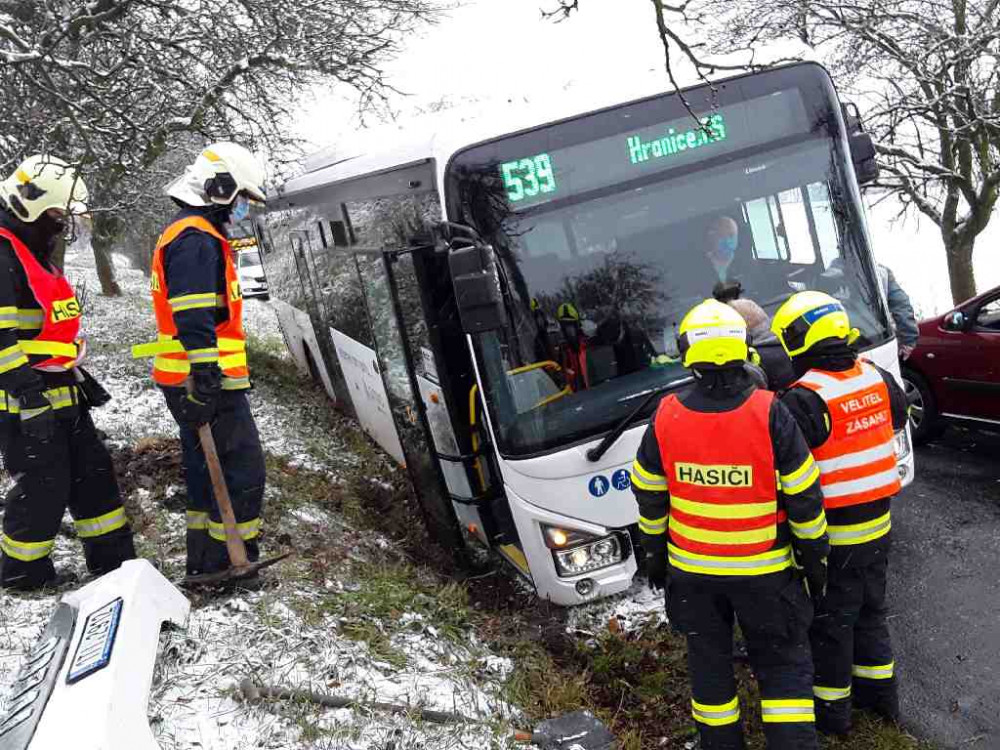FOTO: Hasiči zasahovali u dvou nehod linkových autobusů, zraněn byl řidič i cestující