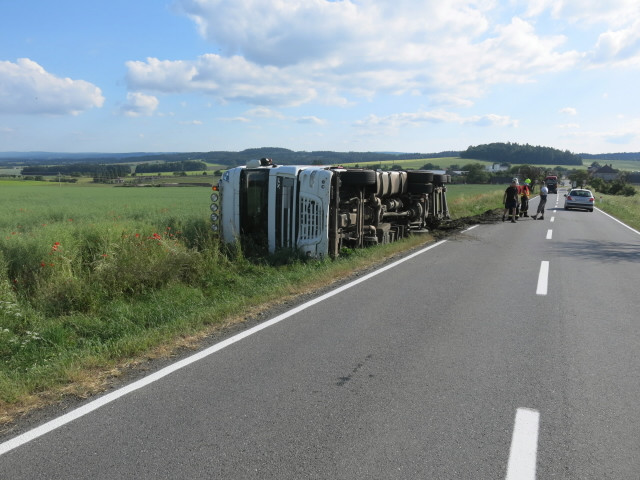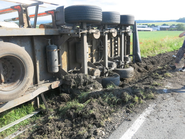 Opilý řidič nezvládl kamion plný dřeva a převrátil ho na bok. Pak se snažil utéct