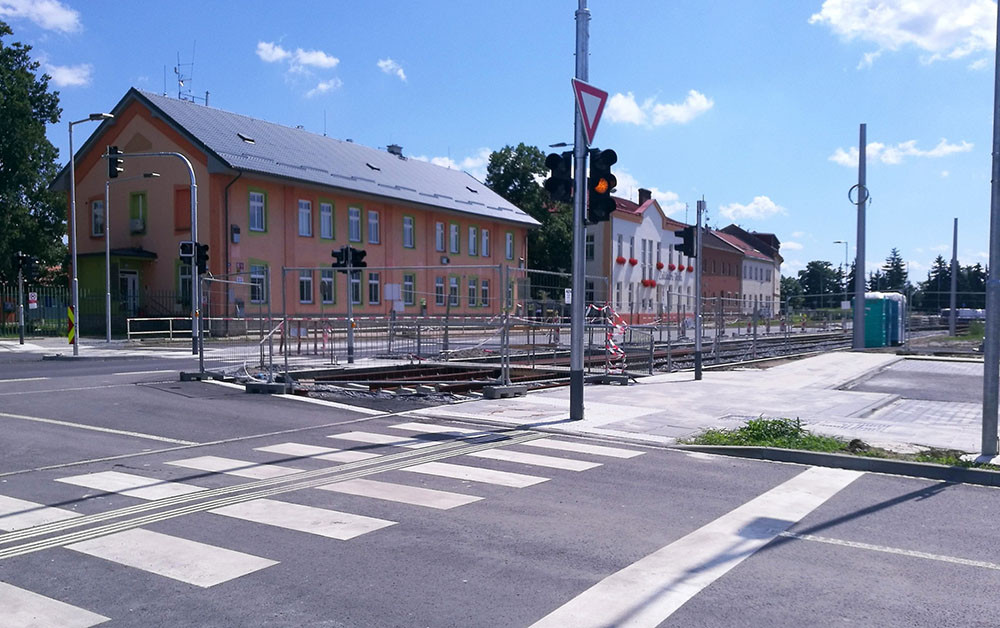 Zbouraný dům nahradily semafory. Stavba tramvajové trati pokročila
