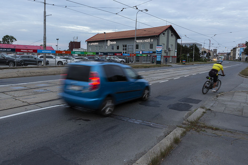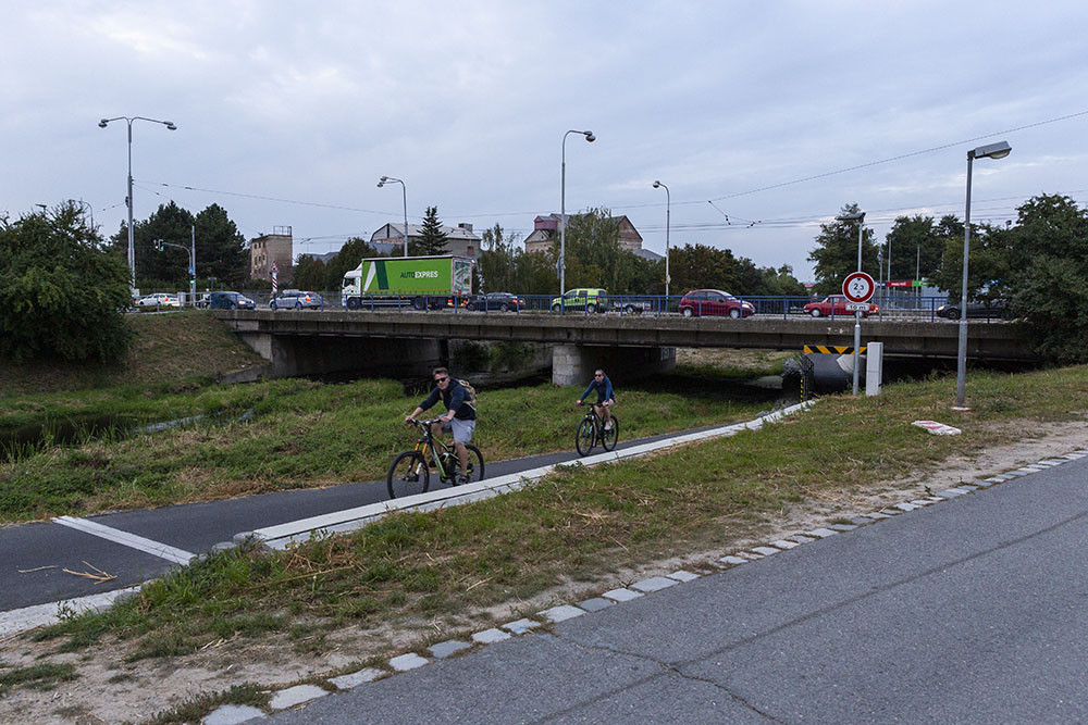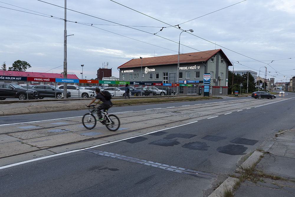 Bílé značení přejezdu pro cyklisty už na Hodolanské ulici u řeky Bystřice není