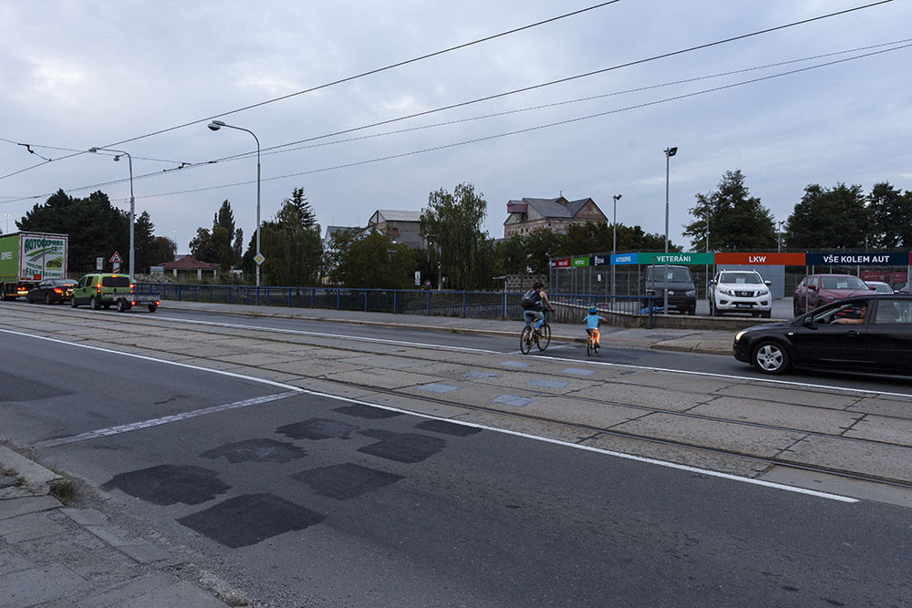 Bílé značení přejezdu pro cyklisty už na Hodolanské ulici u řeky Bystřice není
