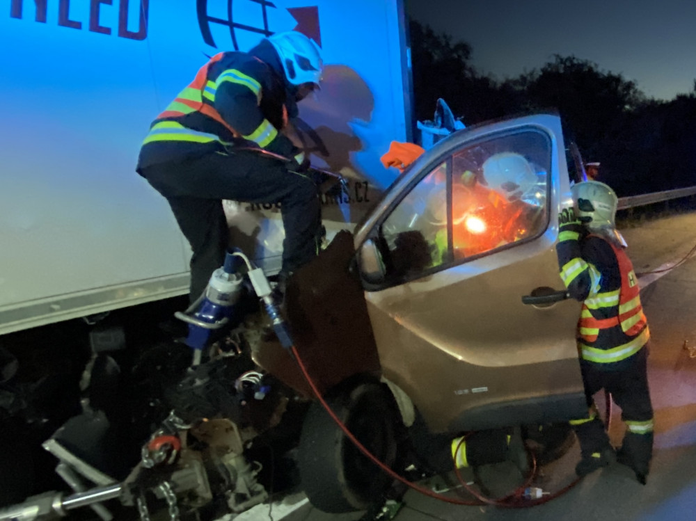 Na D35 u Velké Bystřice hasiči vyprošťovali řidiče dodávky zaklíněné v návěsu kamionu