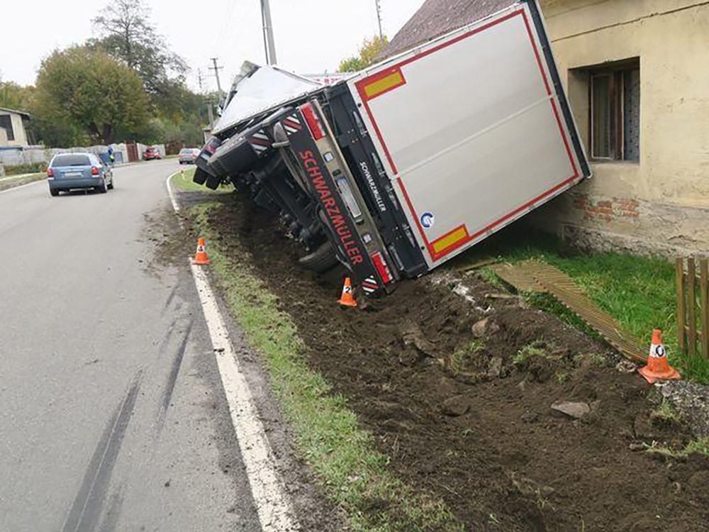Krajnice kamion neunesla. Tahač s návěsem opřel řidič o dům
