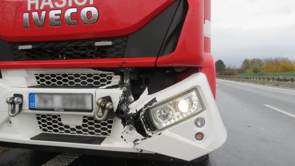 Na dálnici u Loštic z nákladního vozu odletělo kolo a narazilo do hasičů