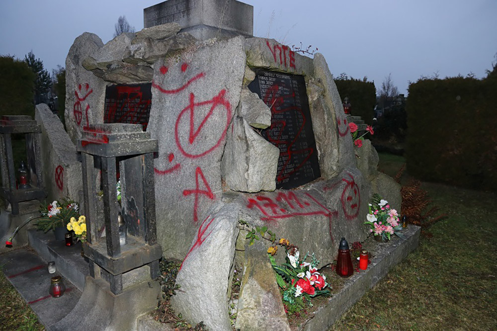 Poničený pomník, socha i náhrobky. Vandal sprejoval na olomouckém hřbitově