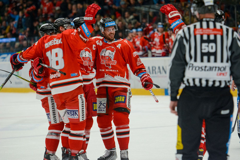 Olomoučtí hokejisté se radují z gólu proti Kladnu