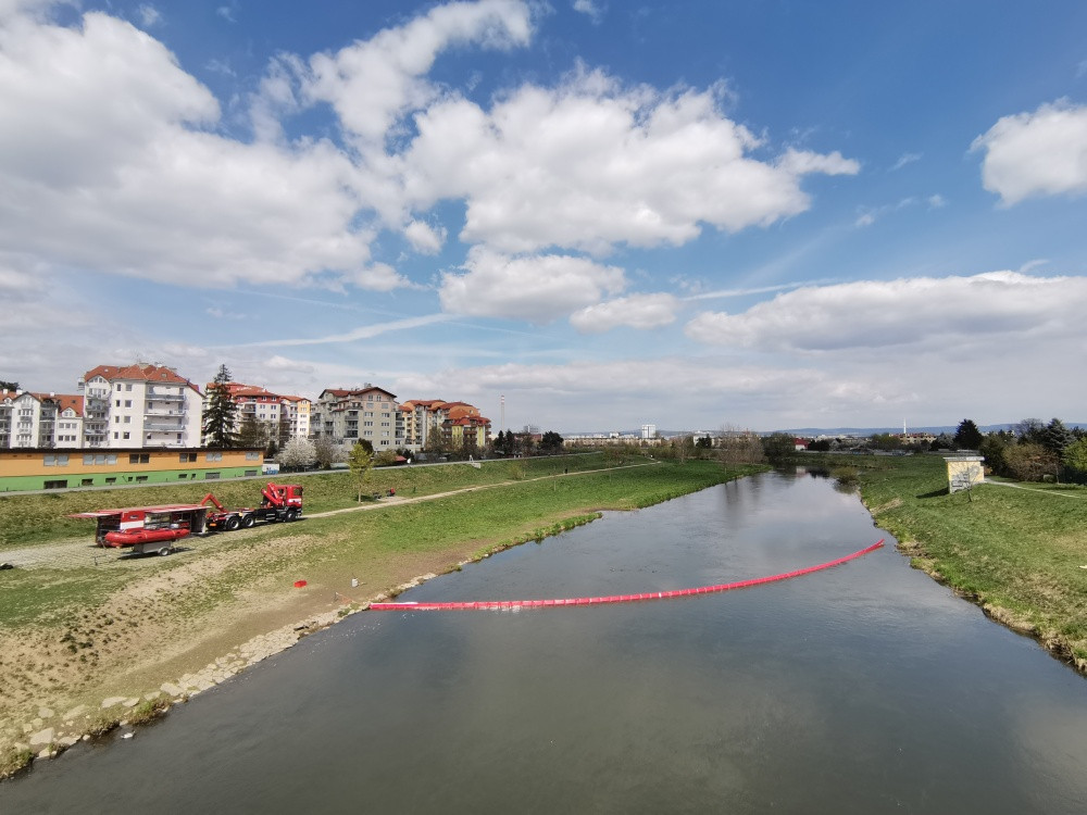 Řeku Moravu v Olomouci přehradili hasiči nornou stěnou. Kvůli barvě z mostu Rejnok