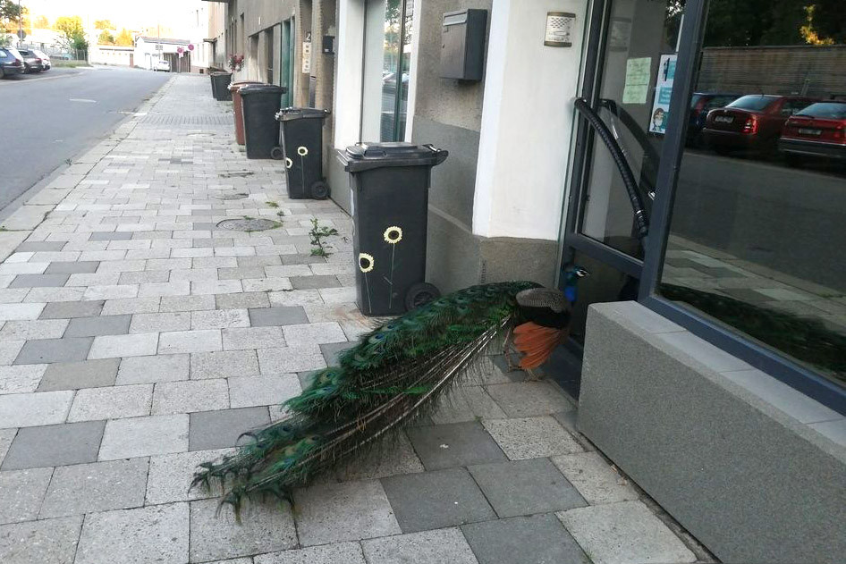 Páv v roli vandala. Vznešenému ptákovi se na výletě Olomoucí znelíbila auta i výloha