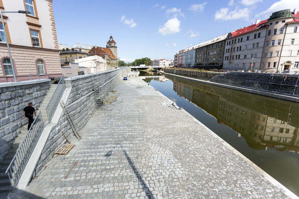 Náplavka mezi dvěma novými mosty v Olomouci má být hotová do konce září