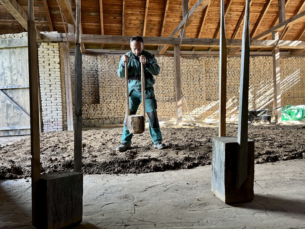 Ve stodole Hanáckého muzea v přírodě se opravuje mlat. Podlahu dokončí hovězím trusem