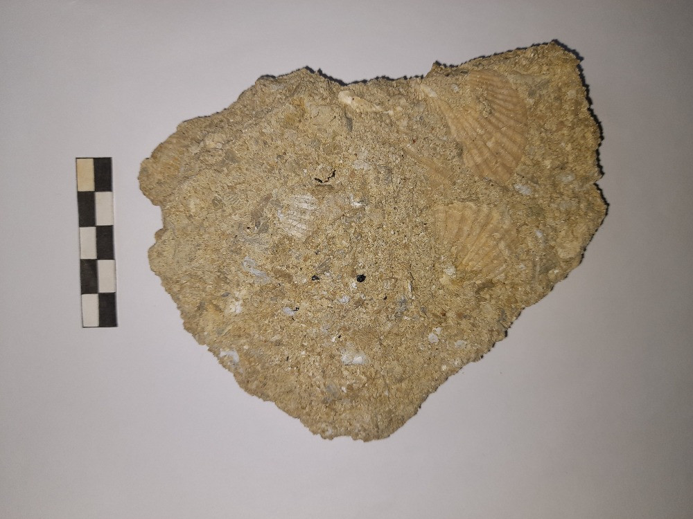 Šedožlutý pískovec s lasturami hřebenatek nalezený v Brodku u Prostějova