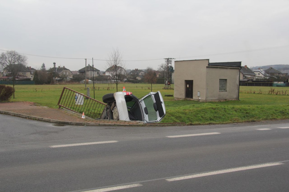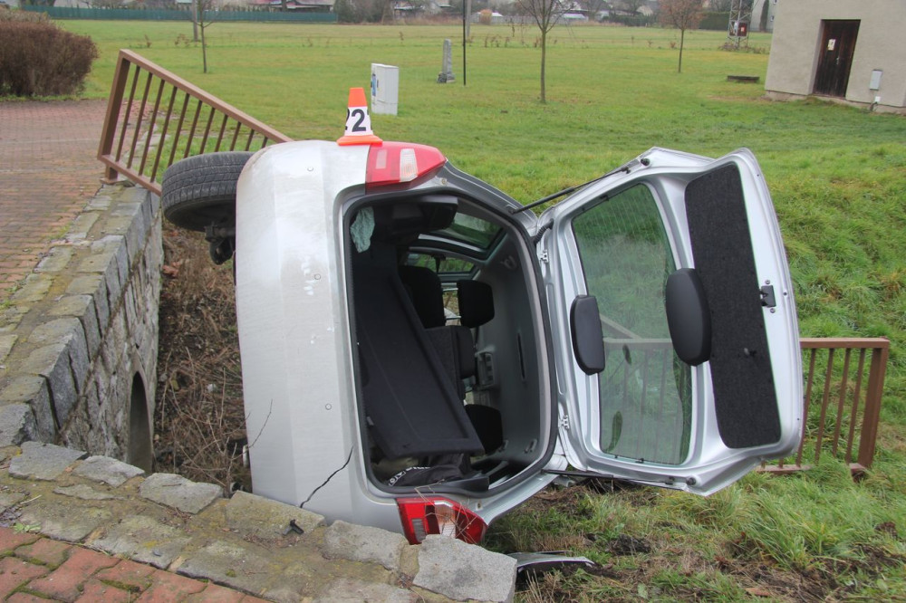 U Bludova žena porazila zábradlí a s autem skončila v hlubokém příkopu. Zřejmě dostala smyk