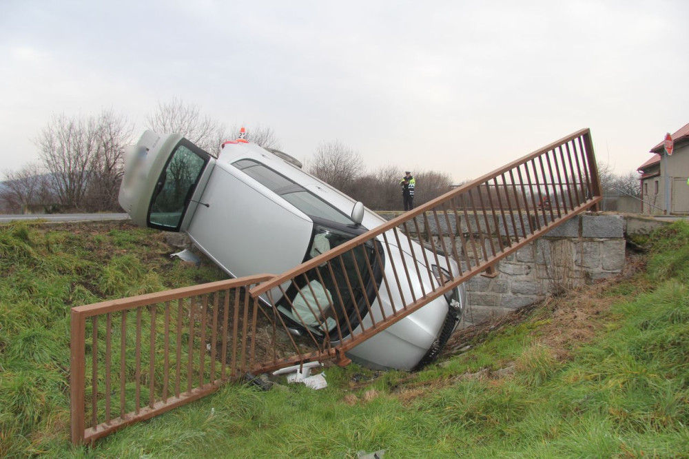 U Bludova žena porazila zábradlí a s autem skončila v hlubokém příkopu. Zřejmě dostala smyk