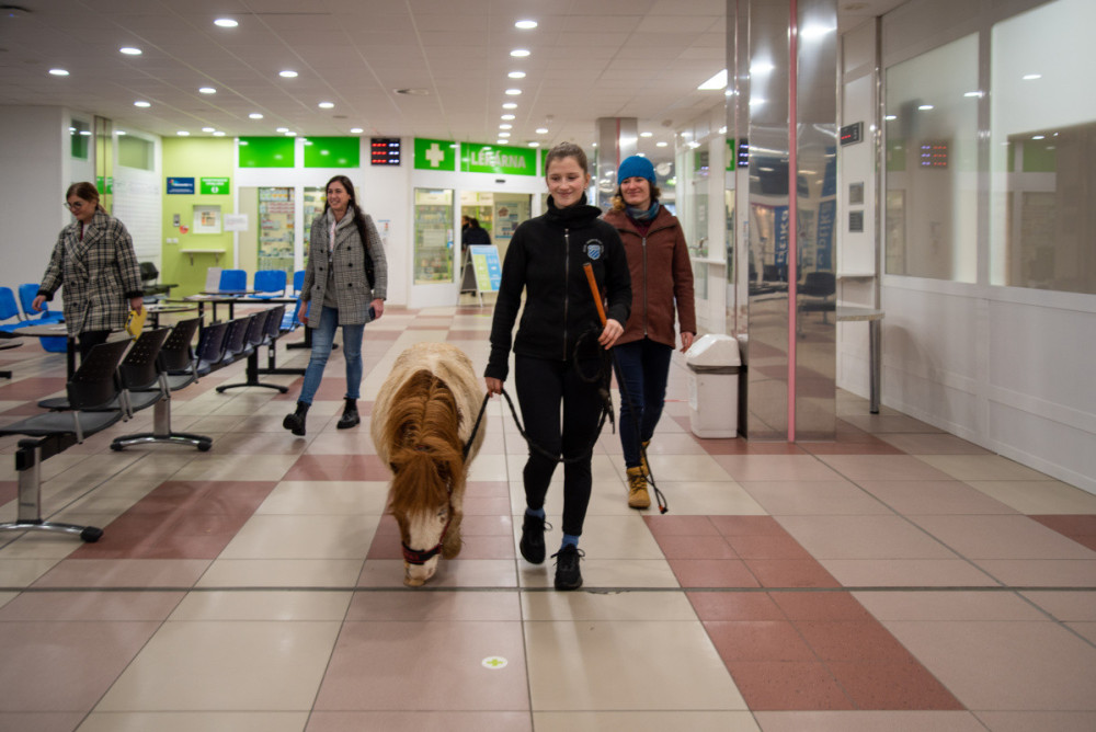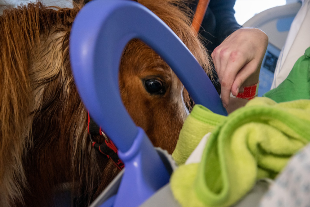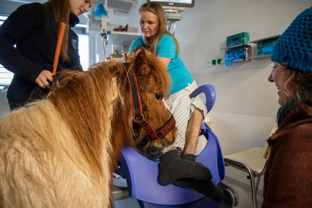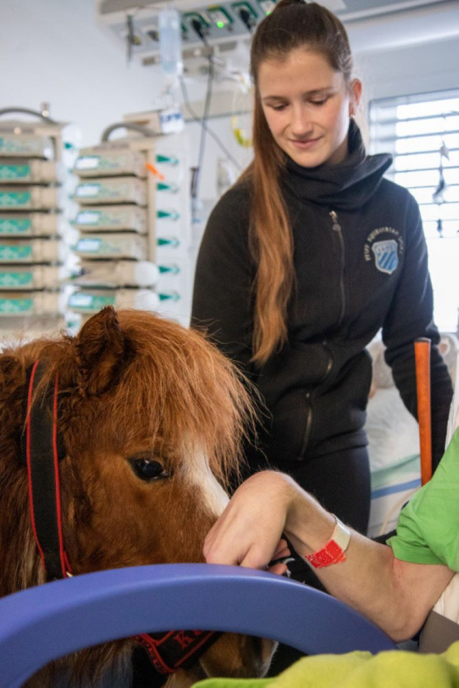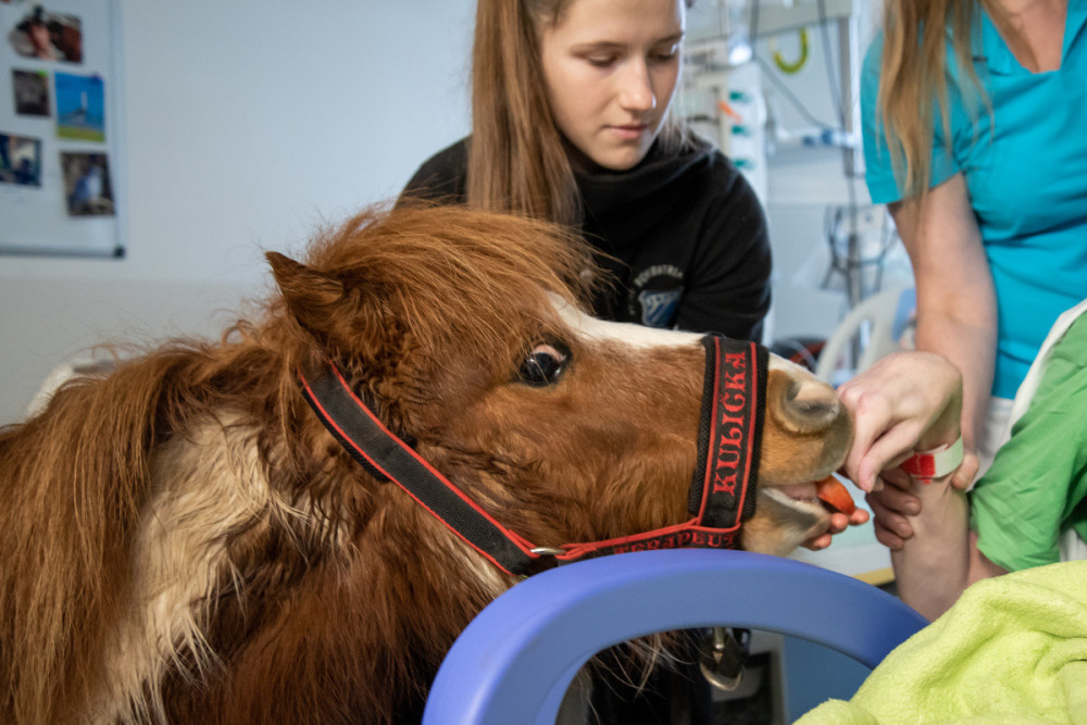 Poník Kulička přišel do olomoucké Fakultní nemocnice potěšit těžce zraněného chovatele koní