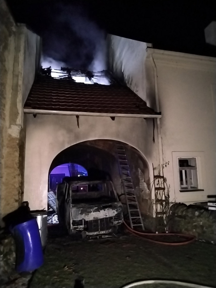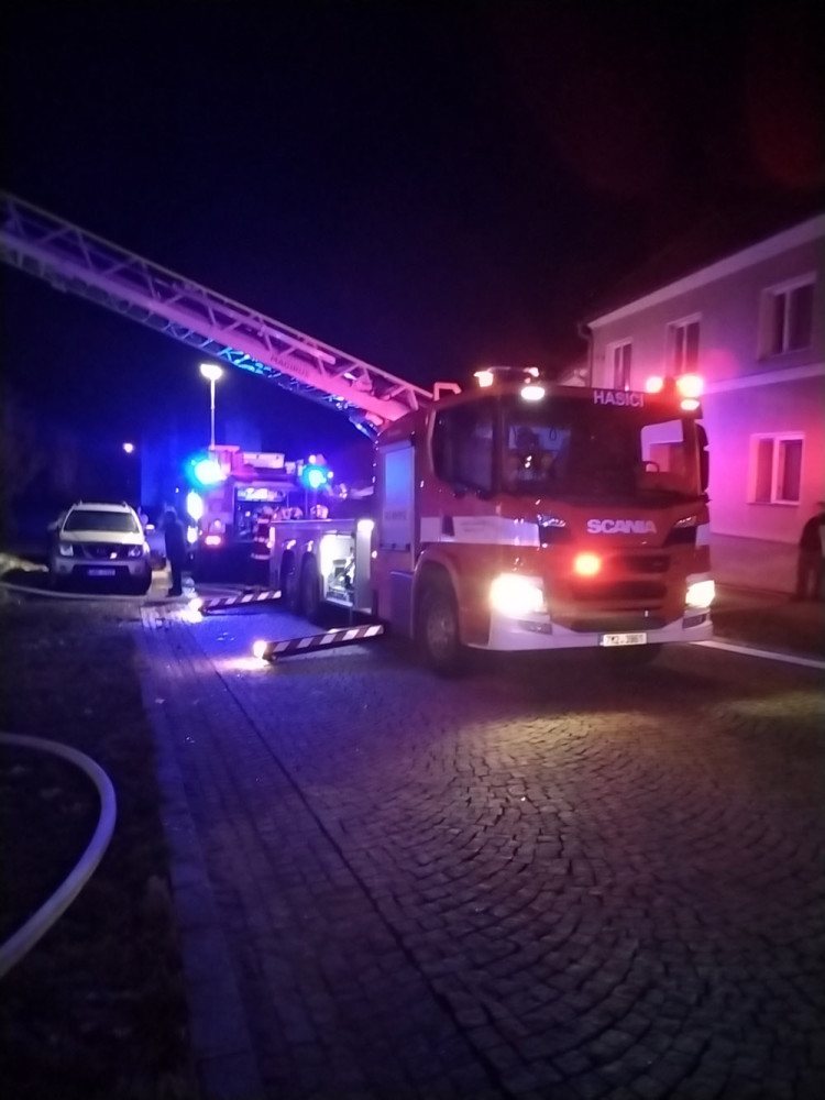 Mezi domy v Ústíně hořela dodávka. Hasiči zasahovali i s výškovou technikou