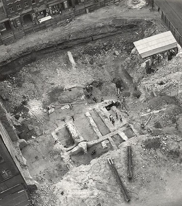 Vykopávky v r. 1973, vpravo zničené základy mořické školy