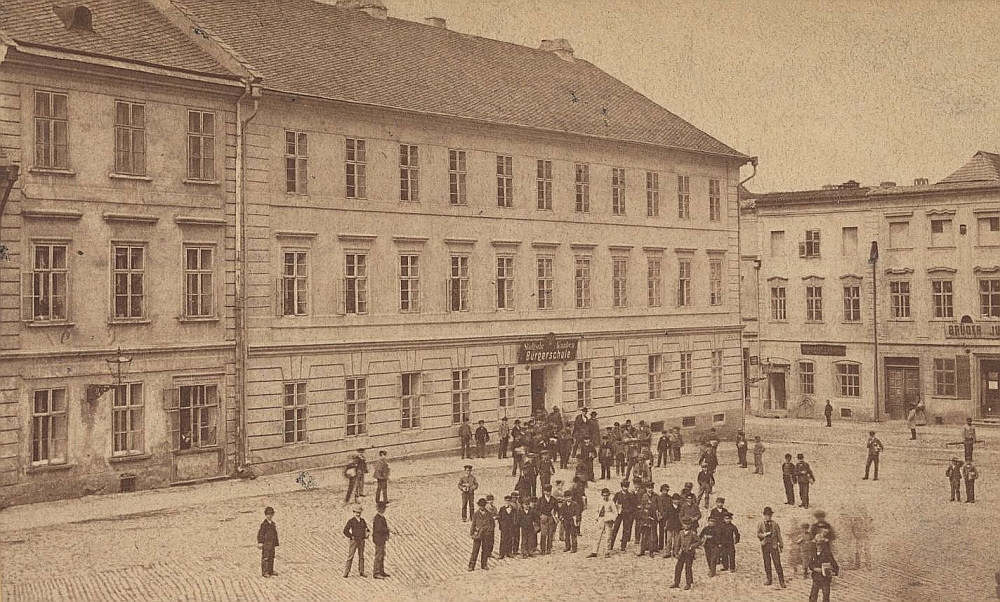 Chlapecká měšťanská škola na Mořickém nám. Foto S. Wasservogel, 1870-1900. (SOkA)