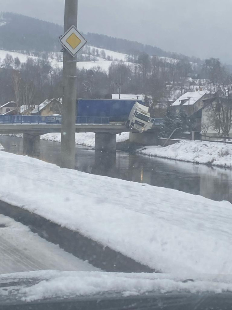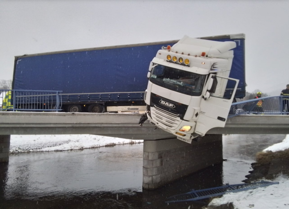 V Mikulovicích zůstal kamion s nákladem viset nad řekou. Hlavní tah do Polska byl pět hodin uzavřený