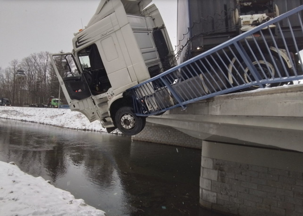V Mikulovicích zůstal kamion s nákladem viset nad řekou. Hlavní tah do Polska je uzavřený