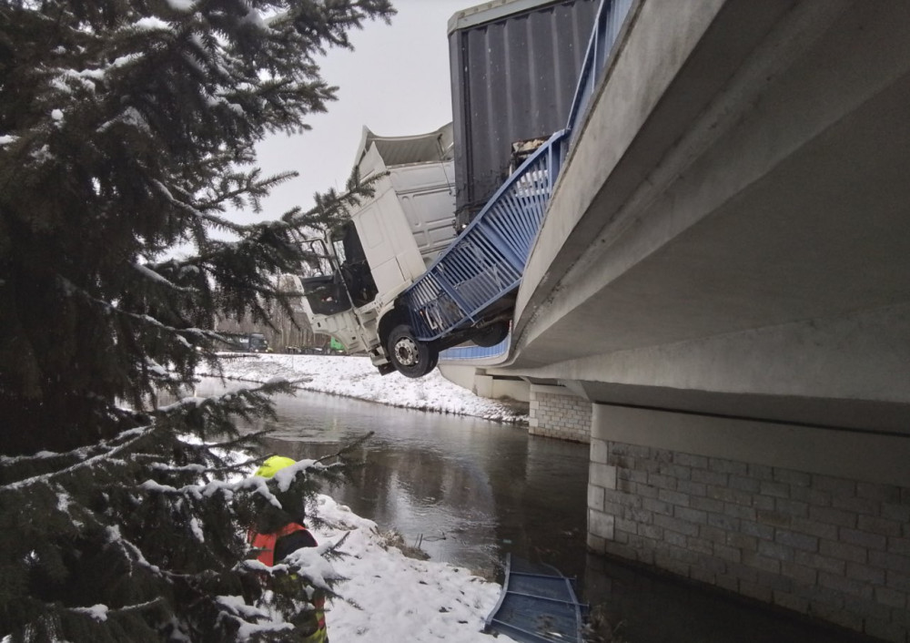 V Mikulovicích zůstal kamion s nákladem viset nad řekou. Hlavní tah do Polska je uzavřený
