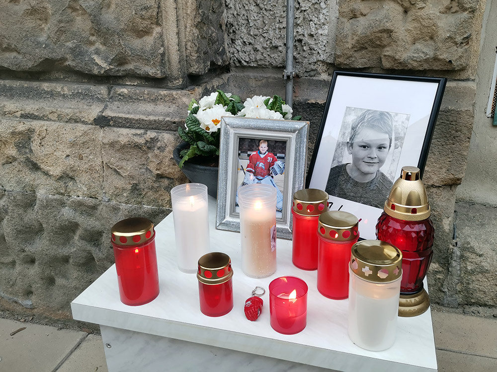 Pietní místo pro zesnulého Adama u Základní školy Spojenců v Olomouci