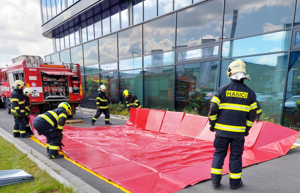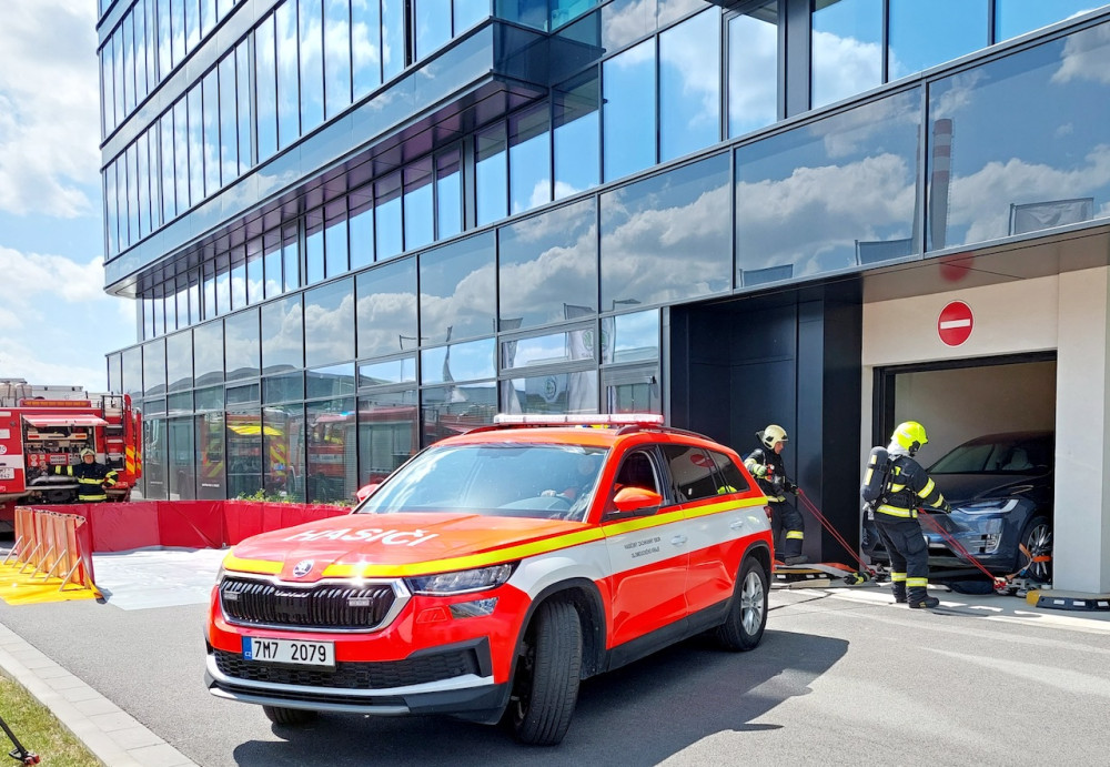Požár elektromobilu v garážích. Hasiči cvičili, jak u hořícího vozidla postupovat