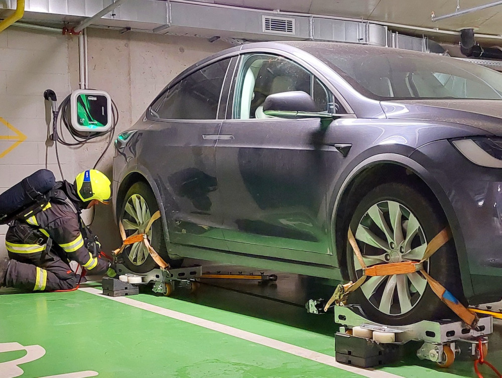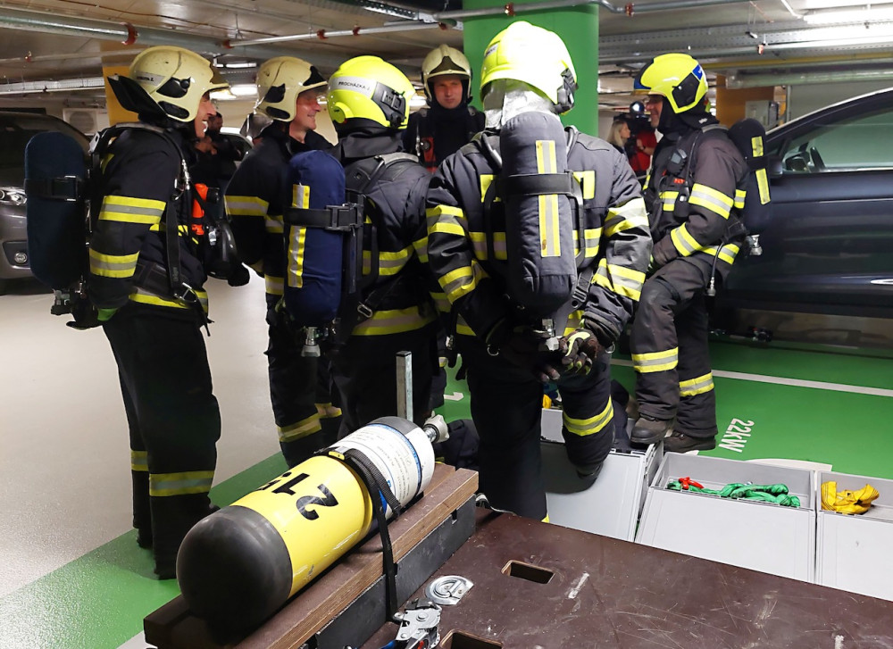 Požár elektromobilu v garážích: Hasiči cvičili, jak u hořícího vozidla postupovat