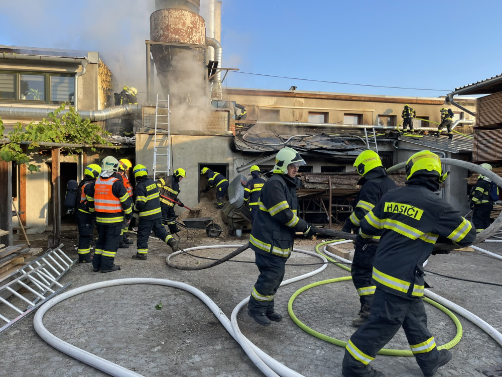 Hasiči zasahovali u požáru v Hlušovicích. Hořela tam výrobna pelet a sklad dřeva