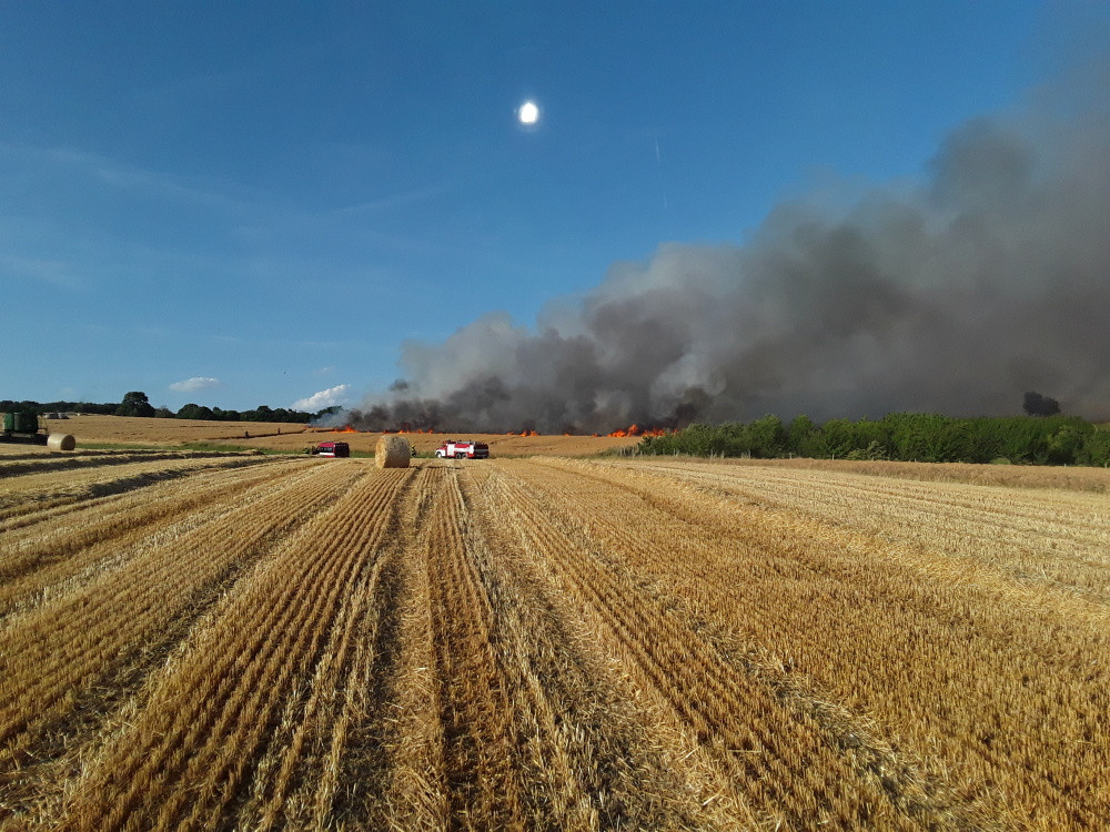 Čtrnáct jednotek hasičů bojuje s požárem na poli u Hranic. Situaci komplikuje silný vítr