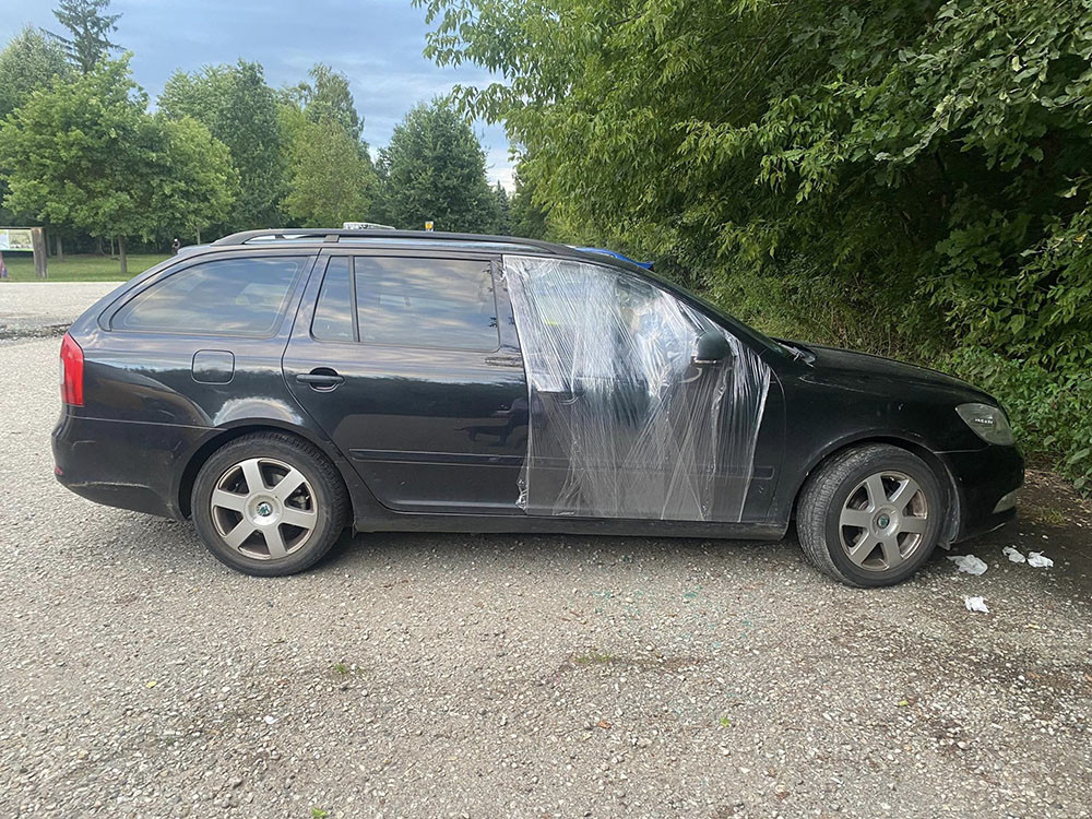 Jedno z poškozených vozidel na parkovišti u přírodního jezera Poděbrady nedaleko Olomouce