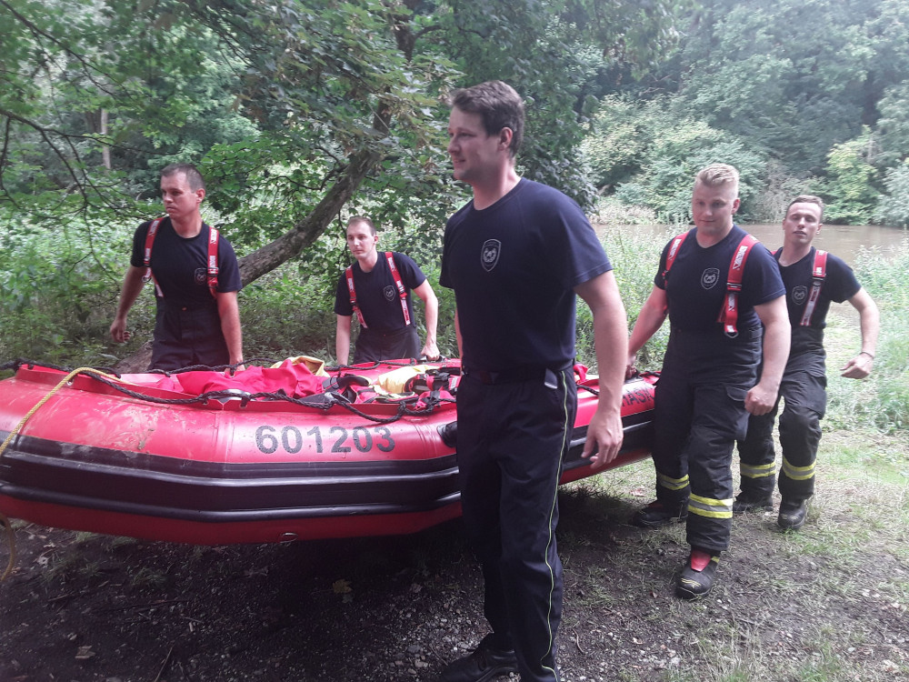 U Střeně hasiči z rozvodněné Moravy zachraňovali pět vodáků. Dítě, muž a tři ženy zůstali uprostřed řeky