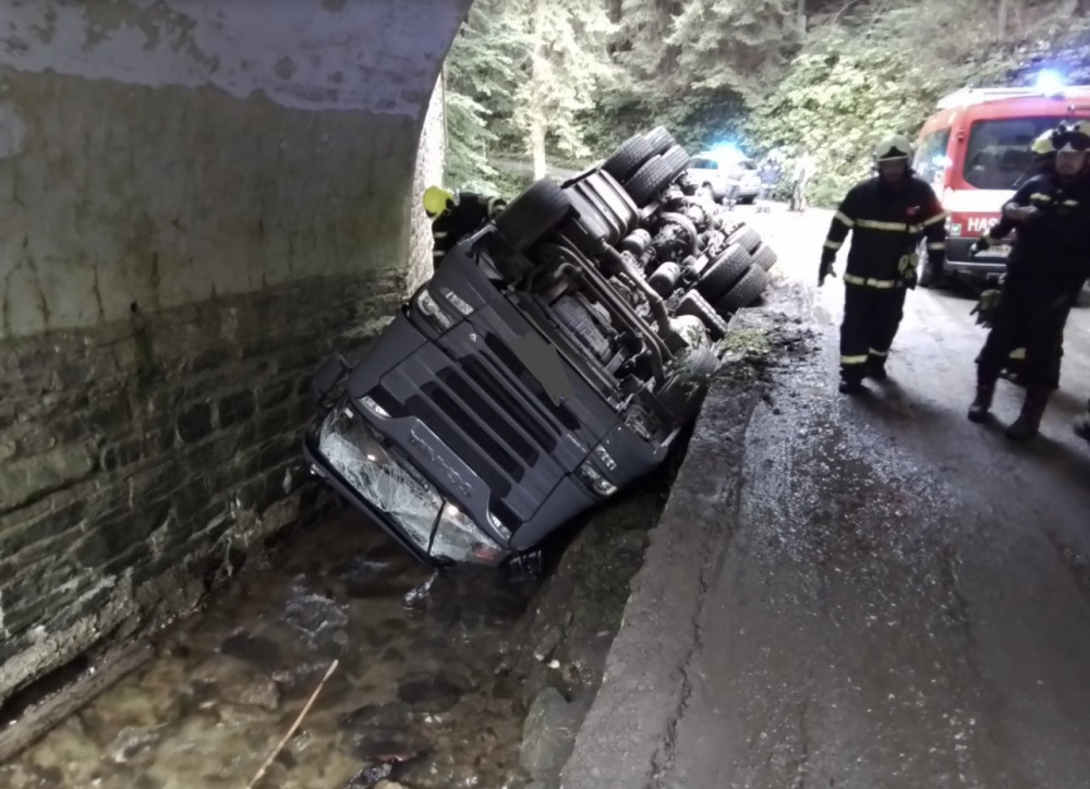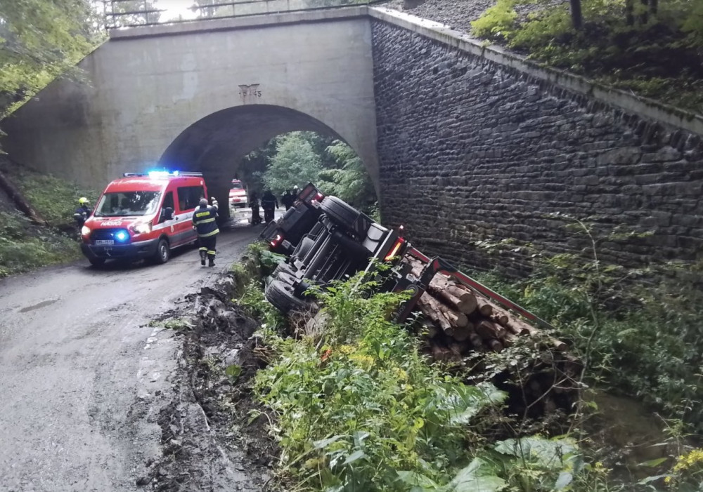 U Branné se kamion se dřevem převrátil do potoka. Do vody vyteklo palivo z prasklé nádrže