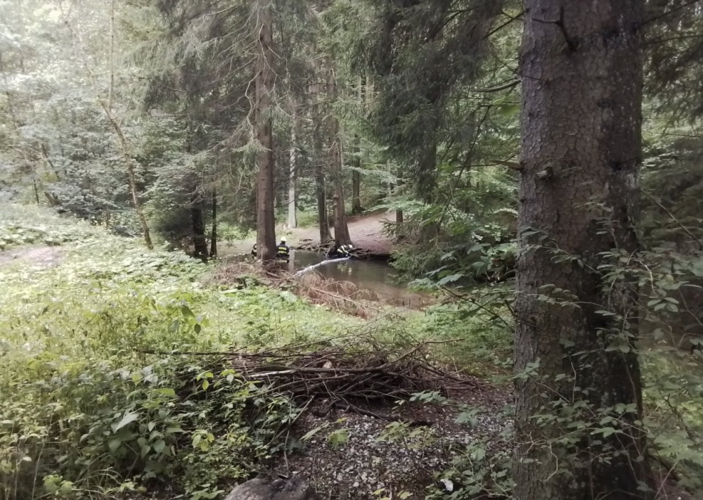 U Branné se nákladní vůz se dřevem převrátil do potoka. Do vody vyteklo palivo z prasklé nádrže