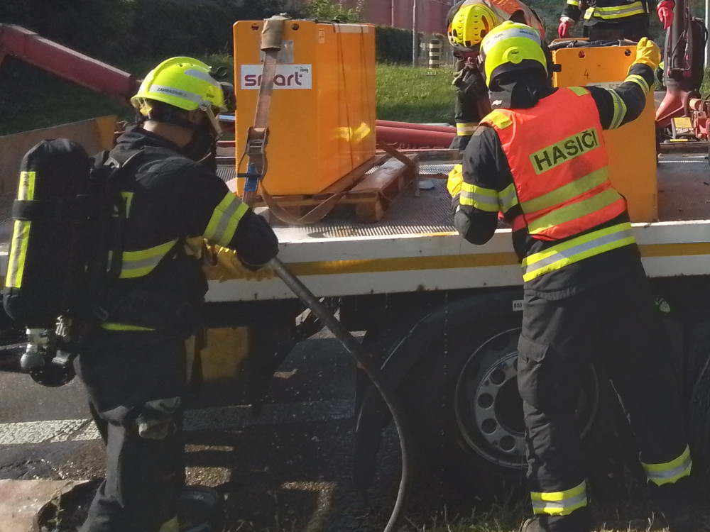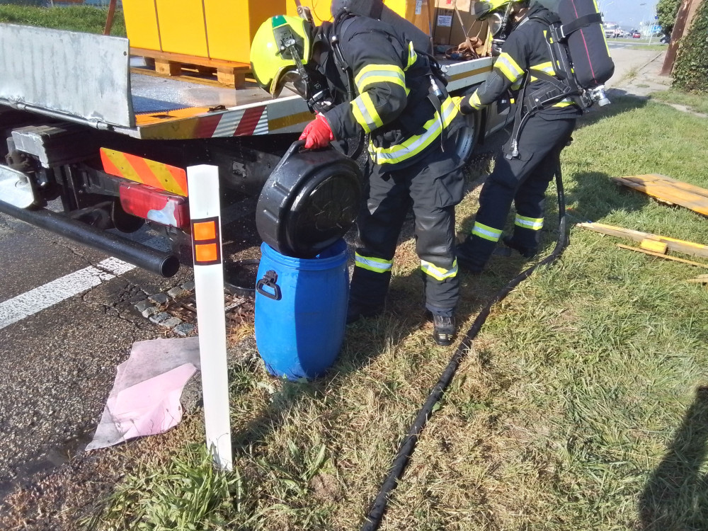 U obchodního centra v Prostějově z kamionu unikla kyselina sírová. Hasiči povolali chemický kontejner