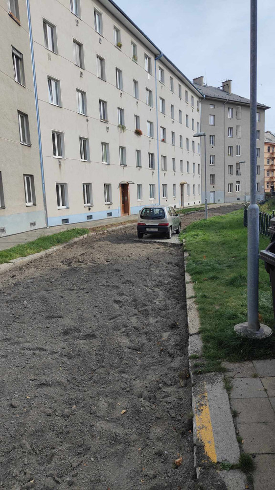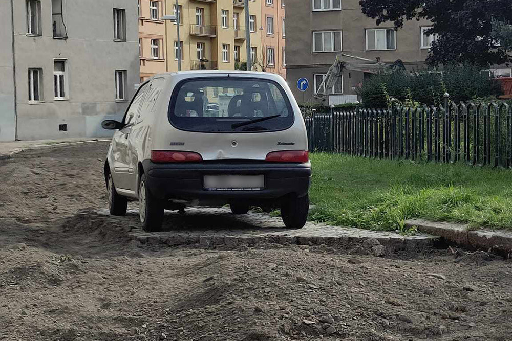 V zóně stavby se neparkuje. Malý Fiat na dlážděném ostrůvku pobavil Olomoučany