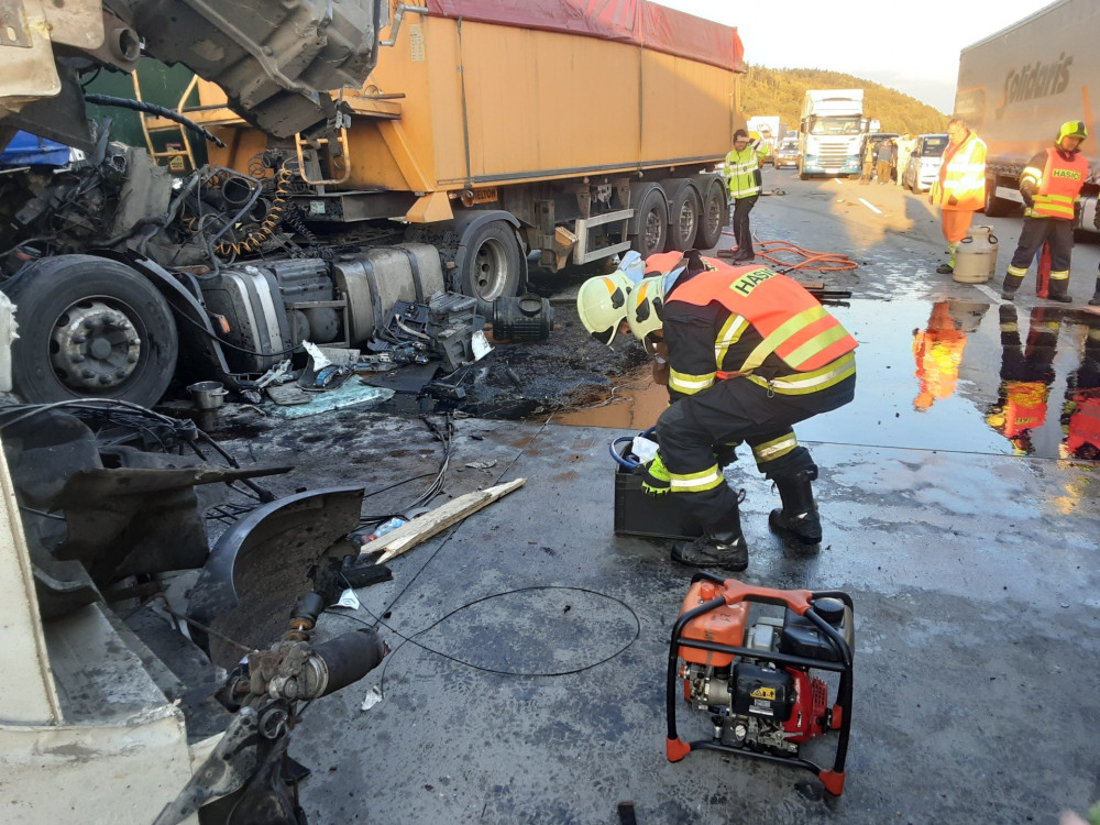 Na dálnici D1 u Milenova na Přerovsku se srazily čtyři kamiony. Dálnice je uzavřená