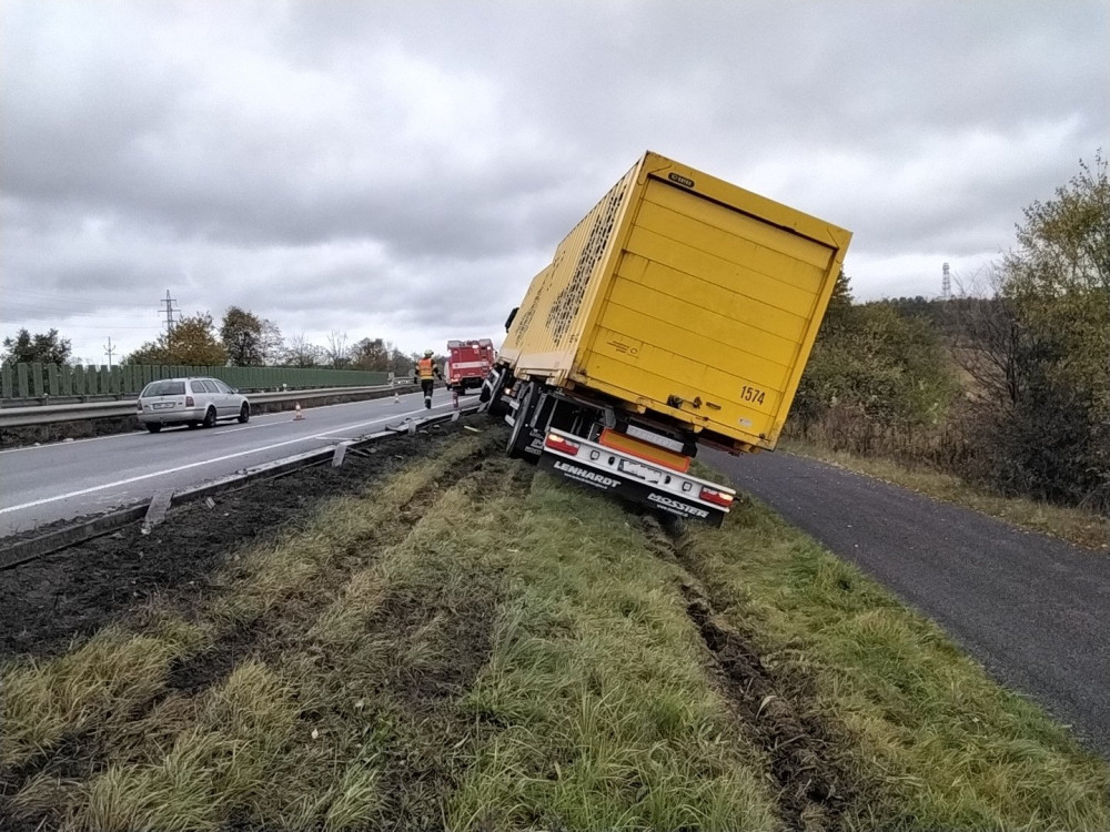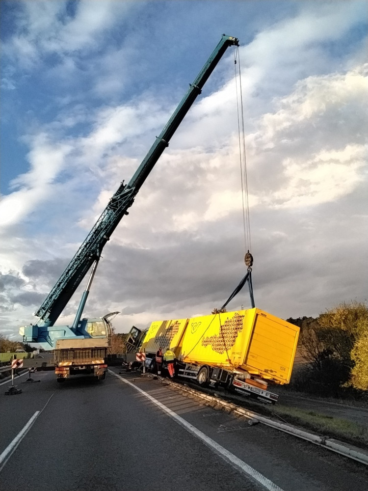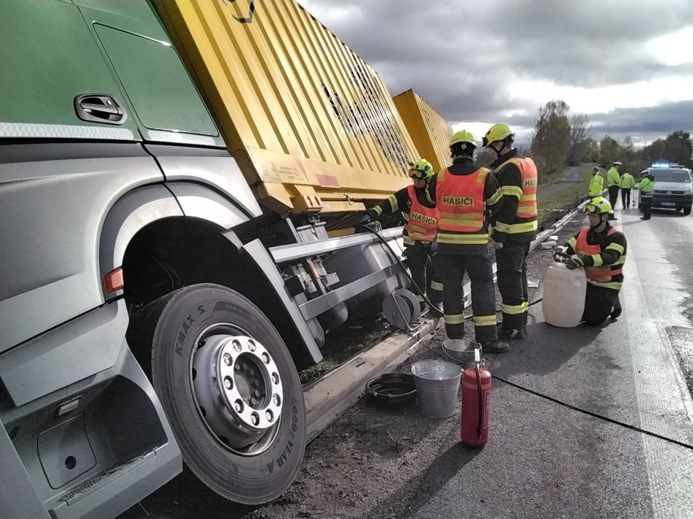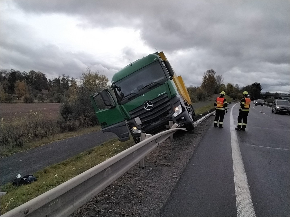 Dálnice D46 u Prostějova směrem na Olomouc byla uzavřená. Hasiči vyprošťovali havarovaný kamion
