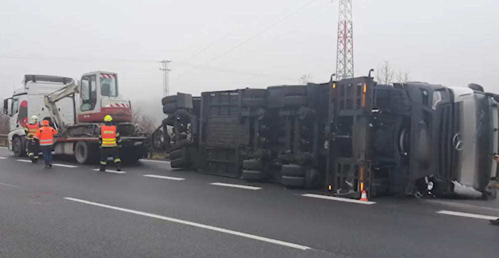 VIDEO: Kamionu začal na dálnici u Olomouce tancovat přívěs. Převrátil se, doprava na Ostravu byla omezená